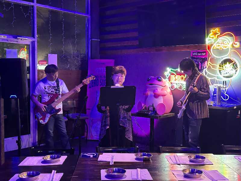現在は「Hong Dae Pocha」という韓国料理店で、毎月第4週末にゆるく演奏しています。メンバーは基本的にギターとベースのみで、その他のパートは音源を使用しています。数曲はお店の方が歌っています。演奏ジャンルは主にロックやポップ系の洋楽と、同系統の韓国の楽曲を演奏しています。このバンドではベース担当で、ぼちぼち他のパートのメンバーも増やしていけたらなと思っています。