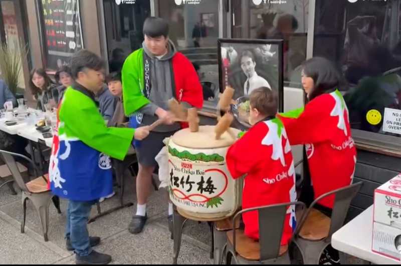 1月1日、元日の正午から、サンフランシスコ日本町にある「ひのでや」で、鏡開きが開催された。鏡開きに使われた酒樽は米国宝酒造が提供した。当日は多くの人が集まり、振る舞い酒も行われた。(写真提供:ひのでや)