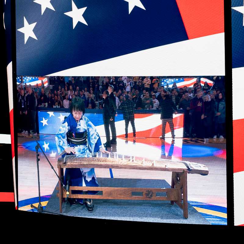 サンフランシスコのチェイスセンターで1月4日、NBA・GSウォリアーズのジャパニーズヘリテージナイトが開催された。お琴による米国国歌斉唱のほか、沖縄県人会がハーフタイムショーのパフォーマンスを披露した。(写真提供:在サンフランシスコ日本国総領事館)